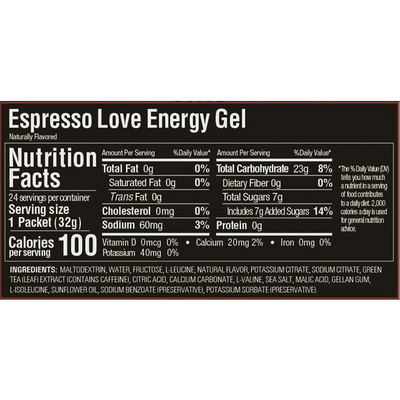 Espresso Love is the ideal flavor for a busy athlete. This flavor will remind you of a bold, rich, dark-roasted cup of joe – so good you might just sip on the gel like it’s a lazy Saturday morning. Plus, with 40mg of caffeine, it’s perfect for those early morning workouts. Love is in the name, and it’s also in the recipe, because here at GU, one of our six core values is love.
