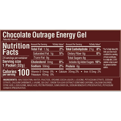 Chocolate Outrage was one of the four original Energy Gel flavors back in 1993, and it remains a favorite to this day. Crafted with organic dark chocolate, this flavor satisfies any cocoa craving. The chocolate taste is rich, sweet, and fudge-like...full of flavor but simple enough that you can enjoy it day after day.
