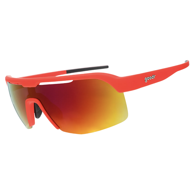 Residents of Dante's fiery inferno are doomed to suffer shin splints that burn like hell for all eternity. Don't worry, though. These red shield, half-rim frames w/ rose reflective lenses won't slip or bounce no matter how schweddy it is there.