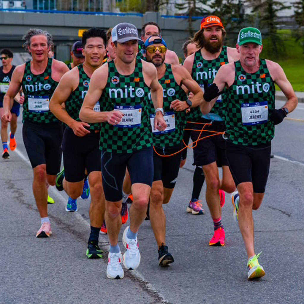 Since the creation of the MitoCanada Foundation in 2009, Strides has provided support in any way possible - through the sale of Team Mito gear at the store, to sourcing shirts for various Team Mito events & races, to providing silent auction items for fundraising initiatives. In spring 2013, MitoCanada founder and president, Blaine Penny, came up with the idea of attempting a Guinness World Record for the fastest 'linked' marathon as a means of raising awareness for mitochondrial disease and funds for MitoCanada. Strides owner, Jeremy Deere, took an active role in organizing the initial Guinness World Record submission and recruiting the team members. The efforts paid off, as the ten-man 'Making Strides Towards a Mito Cure' team set a new Guinness World Record for a linked marathon, running 2:55:24. More importantly, the record attempt gained national media attention, raising much awareness of mitochondrial disease and bringing in over $136,000 in donations, over $40,000 of which was raised by the ten-man linked team (including Strides' Jeremy Deere).
