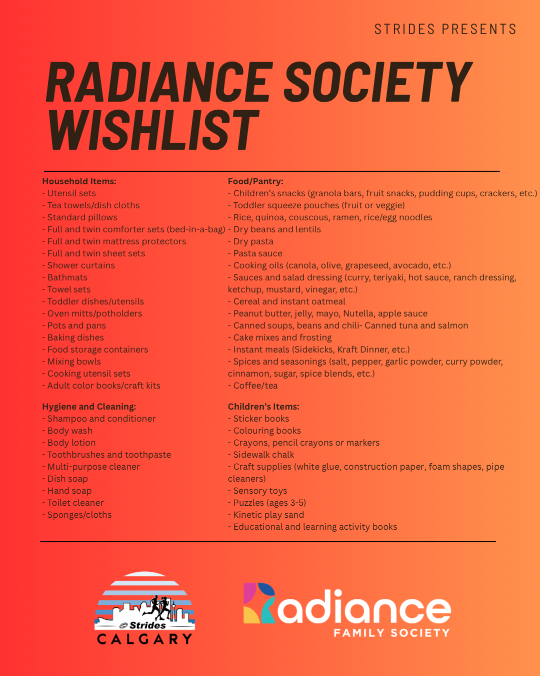 Until the end of December, Strides Calgary locations will be collecting non perishable food and household donations on behalf of the Calgary Food Bank and the Radiance Family Society.